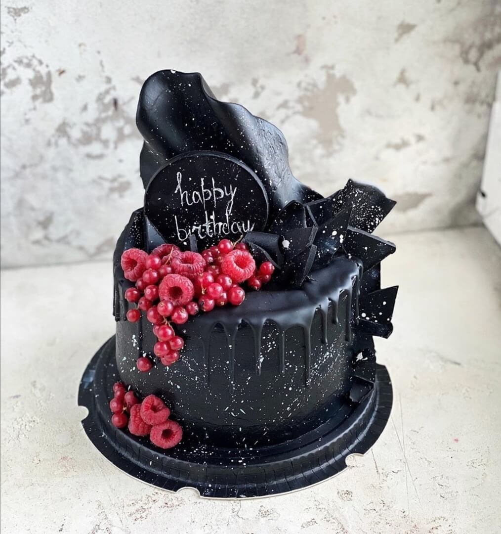Яркие ягодные акценты разбавят строгость черного поздравительного тортика. Необычно, вкусно и незабываемо!