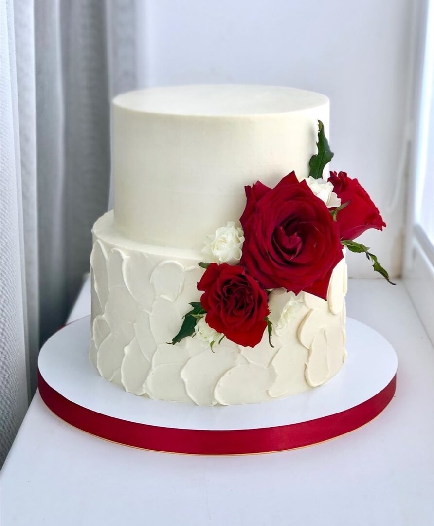 И снова алые розы в сочетании с вкуснейшим бисквитным тортиком для такого важного события